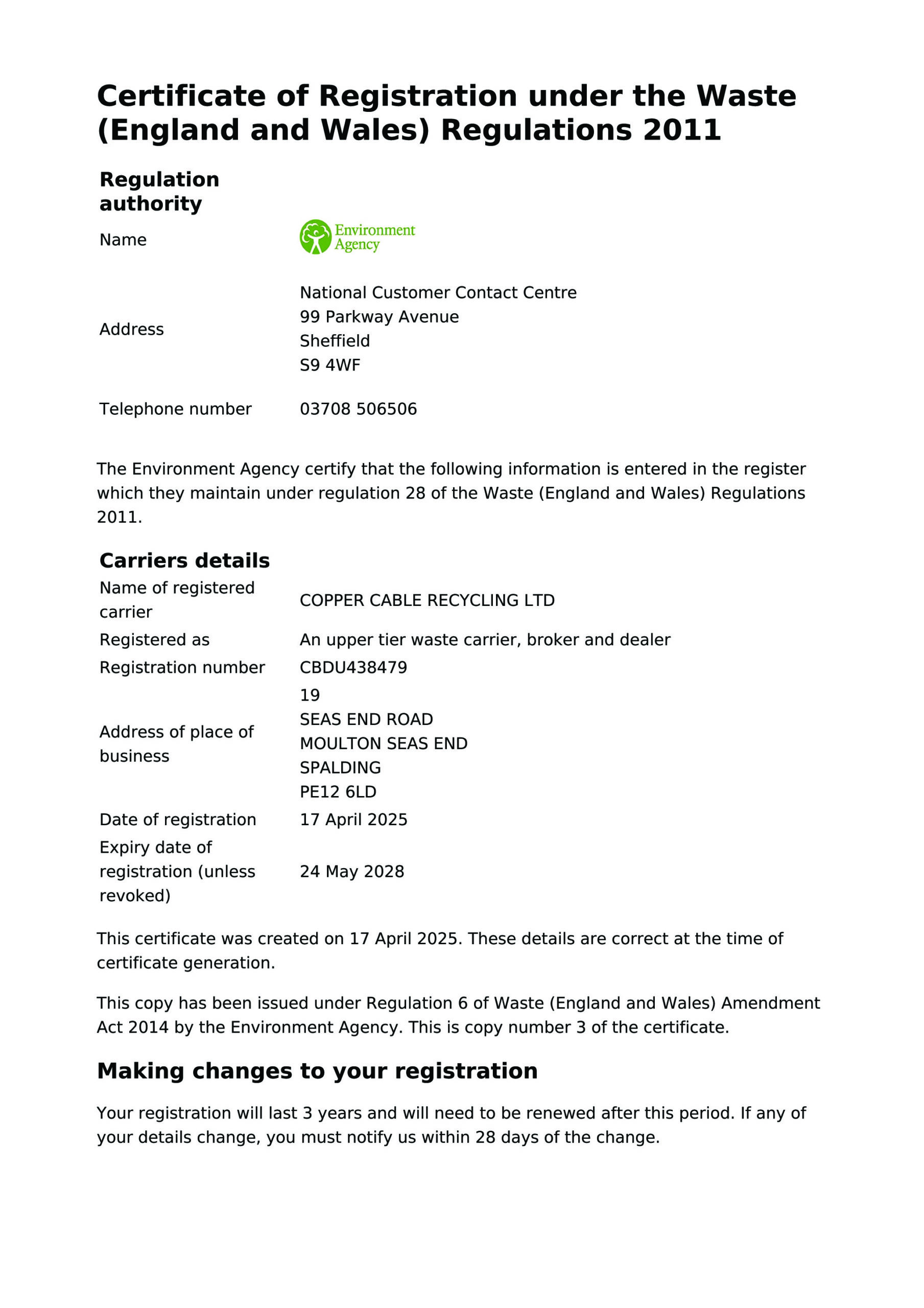 Our state-of-the-art Cable Shredding equipment recovers copper metal and PVC plastics for recycling in the UK, with less than 1% waste. There is high demand for copper from foundries, plus many industries including construction and transport. Copper Cable Recycling Ltd is certified as an Upper Tier Waste Carrier, Broker & Dealer by The Environment Agency.